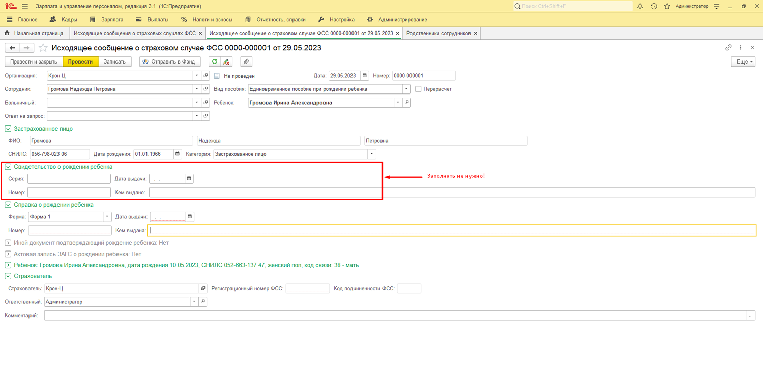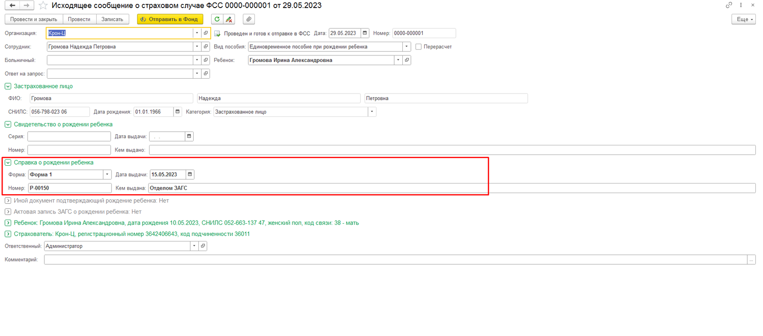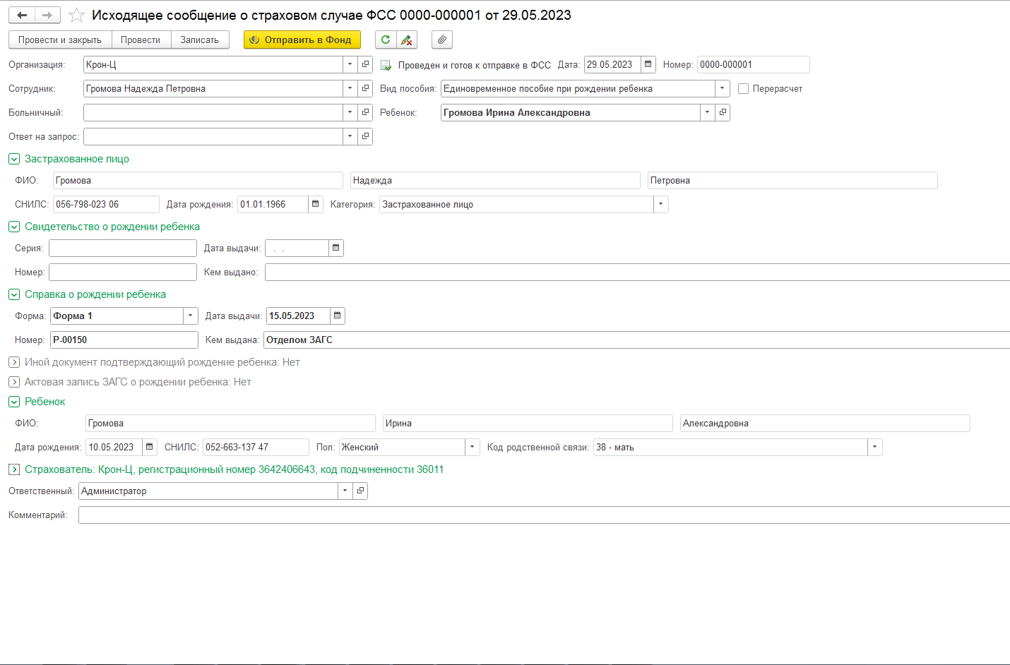Отправка сведений в ФСС на выплату единовременного пособия при рождении ребенка в "1С:ЗУП 3.1"