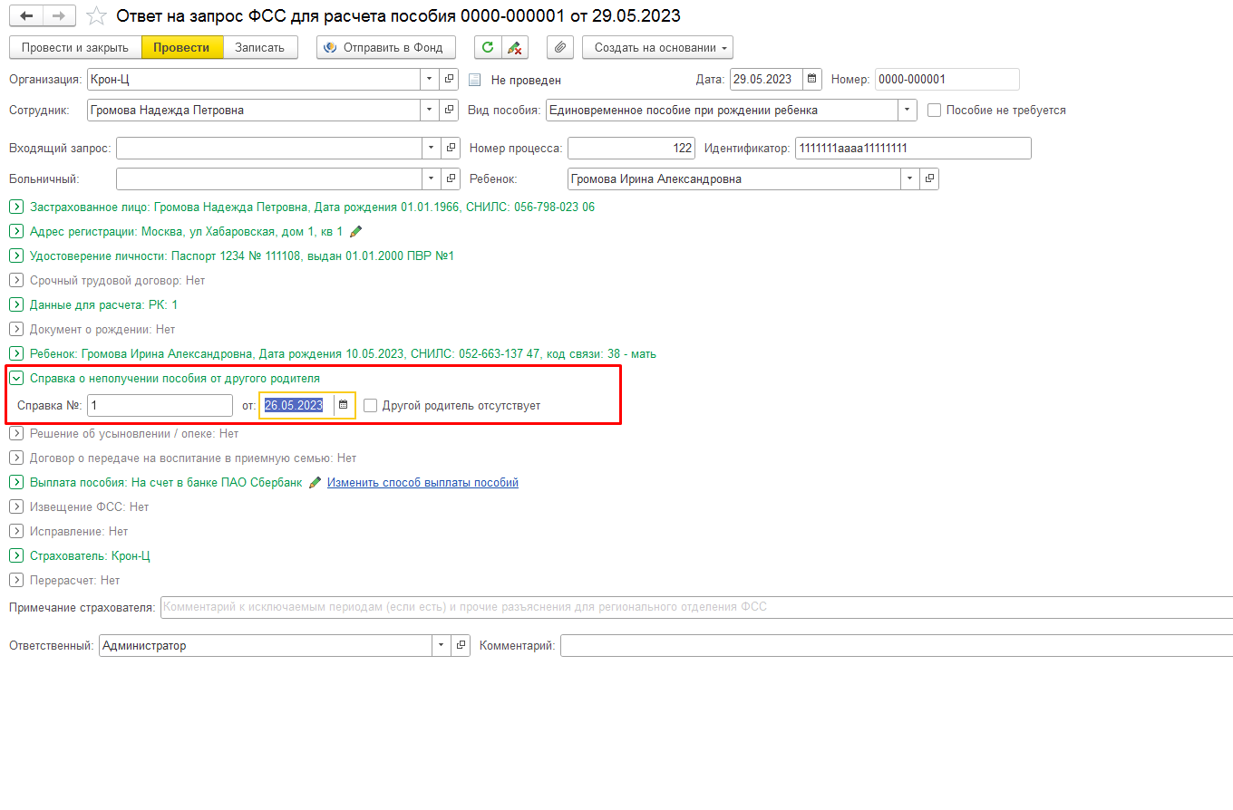 В ответе на входящий запрос ФСС обязательно нужно заполнить реквизиты полей "Справка о неполучении пособия от другого родителя".